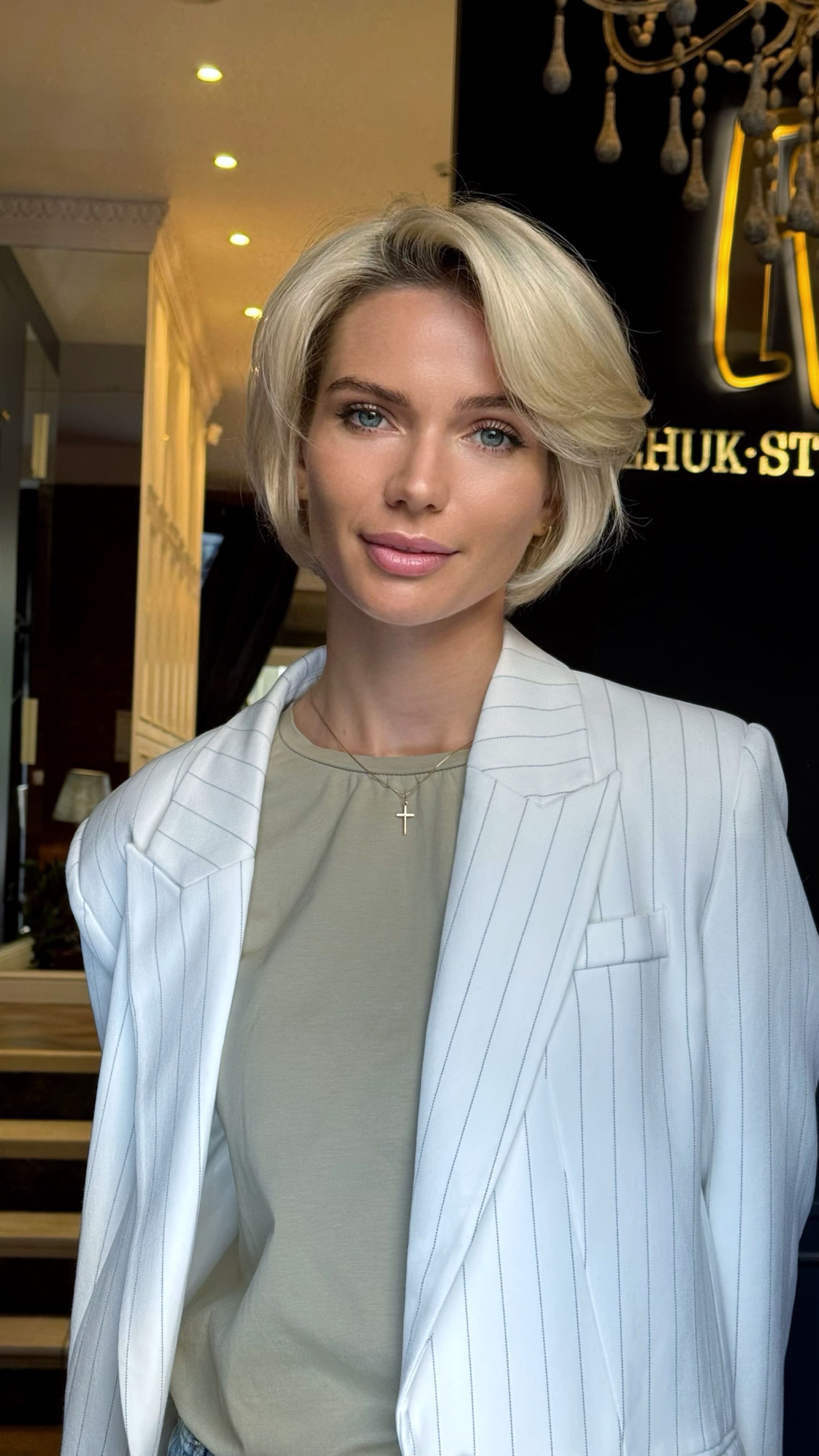 Прошла обучение у Vidal Sassoon, по техникам стрижек.